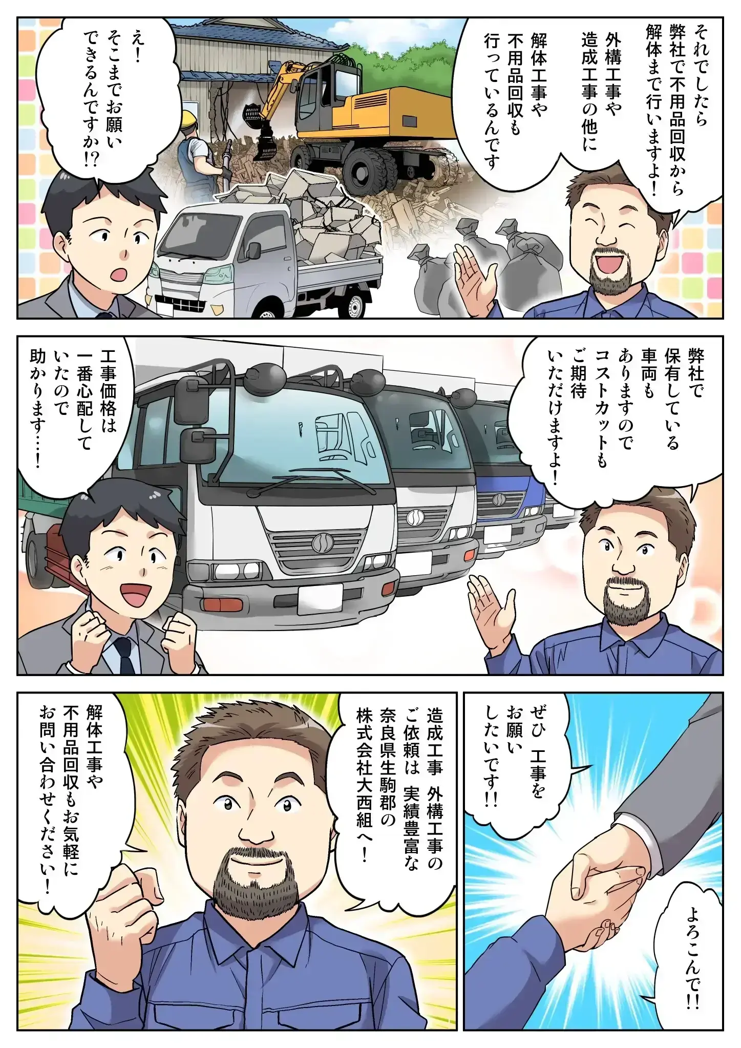 土木工事のほか、解体工事や不用品回収にも対応します。土木工事も、造成工事や公共工事・外構工事が対応可能です。